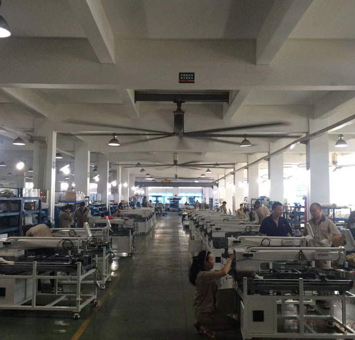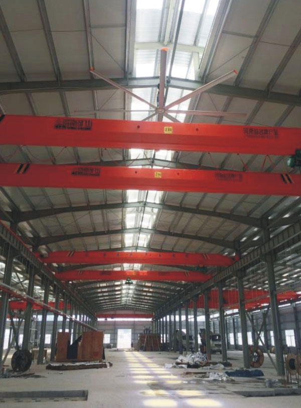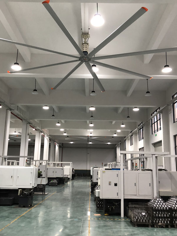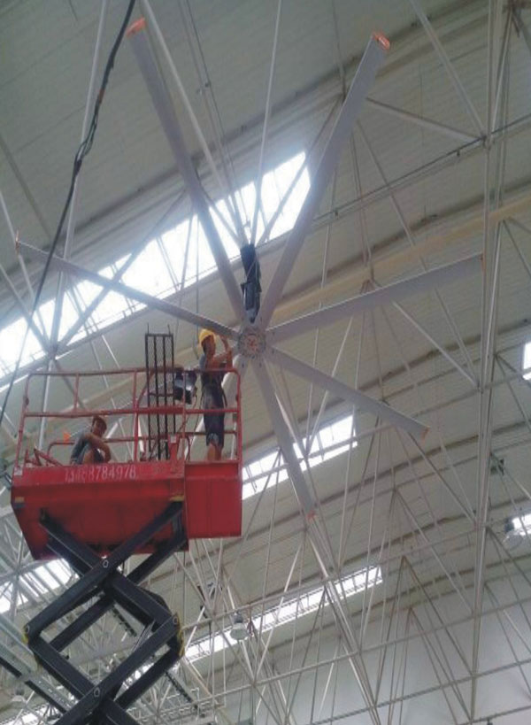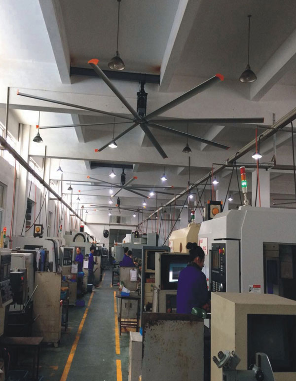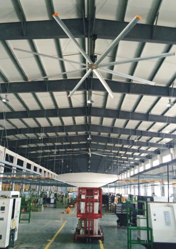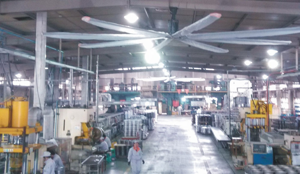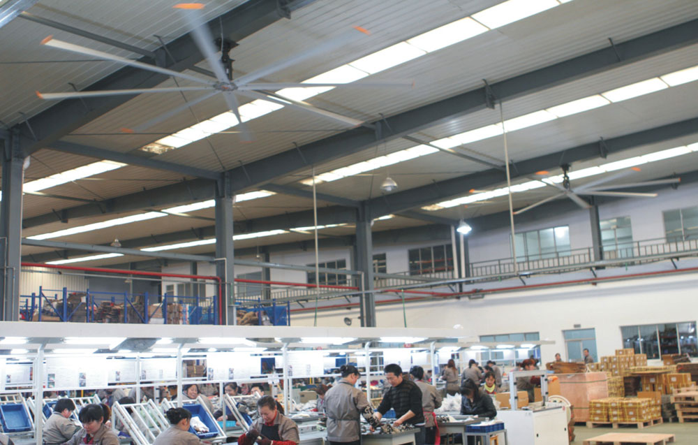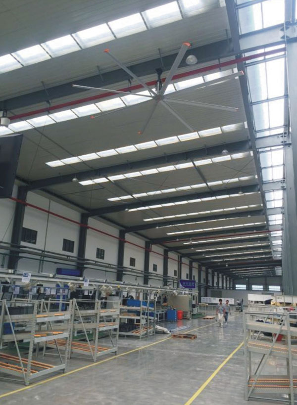 我公司生產(chǎn)的大型工業(yè)吊扇直接懸掛在廠(chǎng)房屋梁下,風(fēng)力柔和,能加快車(chē)間空氣流通,有效降低車(chē)間內(nèi)溫度,改善車(chē)間空氣環(huán)境質(zhì)量,有利于員工的身體健康。